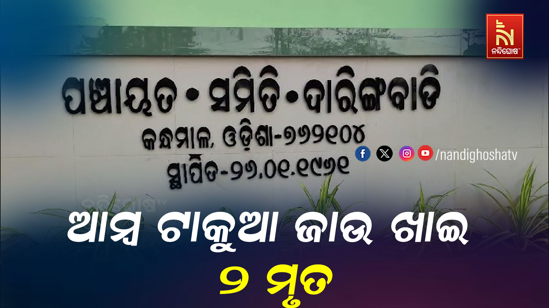 କନ୍ଧମାଳ: ଫେରିଲା ଆମ୍ବ ଟାକୁଆ ଜାଉ କଳଙ୍କ । କନ୍ଧମାଳ ଜିଲ୍ଲା ଦାରିଙ୍ଗବାଡ଼ି ବ୍ଳକ ମାଣ୍ଡିପଙ୍କା ଗାଁରେ ଆମ୍ବ ଟାକୁଆ ଜାଉ ଖାଇ ଦୁଇ ଜଣଙ୍କର ମୃତ୍ଯୁ ହୋଇଛି । ଏହାଛଡ଼ା ୬ ଜଣ ଗୁରୁତର ଅବସ୍ଥାରେ ବ୍ରହ୍ମପୁର ଏମକେସିଜି ମେଡିକାଲରେ ଚିକିତ୍ସିତ ହେଉଛନ୍ତି । ମୃତକ ହେଲେ ମାଣ୍ଡିପଙ୍କା ଗାଁର ୩୦ ବର୍ଷୀୟା ରୁନି ମାଝୀ ଓ ୨୮ ବର୍ଷୀୟା ରନିତା ପାଟମାଝୀ । ୬ ଗୁରୁତର ହେଲେ ପ୍ରଭାତୀ ମାଝୀ, ଶୁସନା ମାଝୀ, ଜିତା ମାଝୀ, ଦ୍ରେଙ୍ଗାଲୁ ପାଟମାଝୀ, ଜୀବନ୍ତ ପାଟମାଝୀ ଓ ଟୁନି ମାଝୀ । ଅଭିଯୋଗ ଅନୁସାରେ ଗତ ୨୩ ତାରିଖରେ ୨୦ ପରିବାରର ୩୦ରୁ ଅଧିକ ଲୋକ ପ୍ରଥମେ ଆମ୍ବ ଟାକୁଆ ଜାଉ କରି ଖାଇଥିଲେ । ବଳକା ଟାକୁଆକୁ ଗତ ୨୯ ତାରିଖରେ ପୁଣିଥରେ ଜାଉକରି ଖାଇଥିଲେ ।