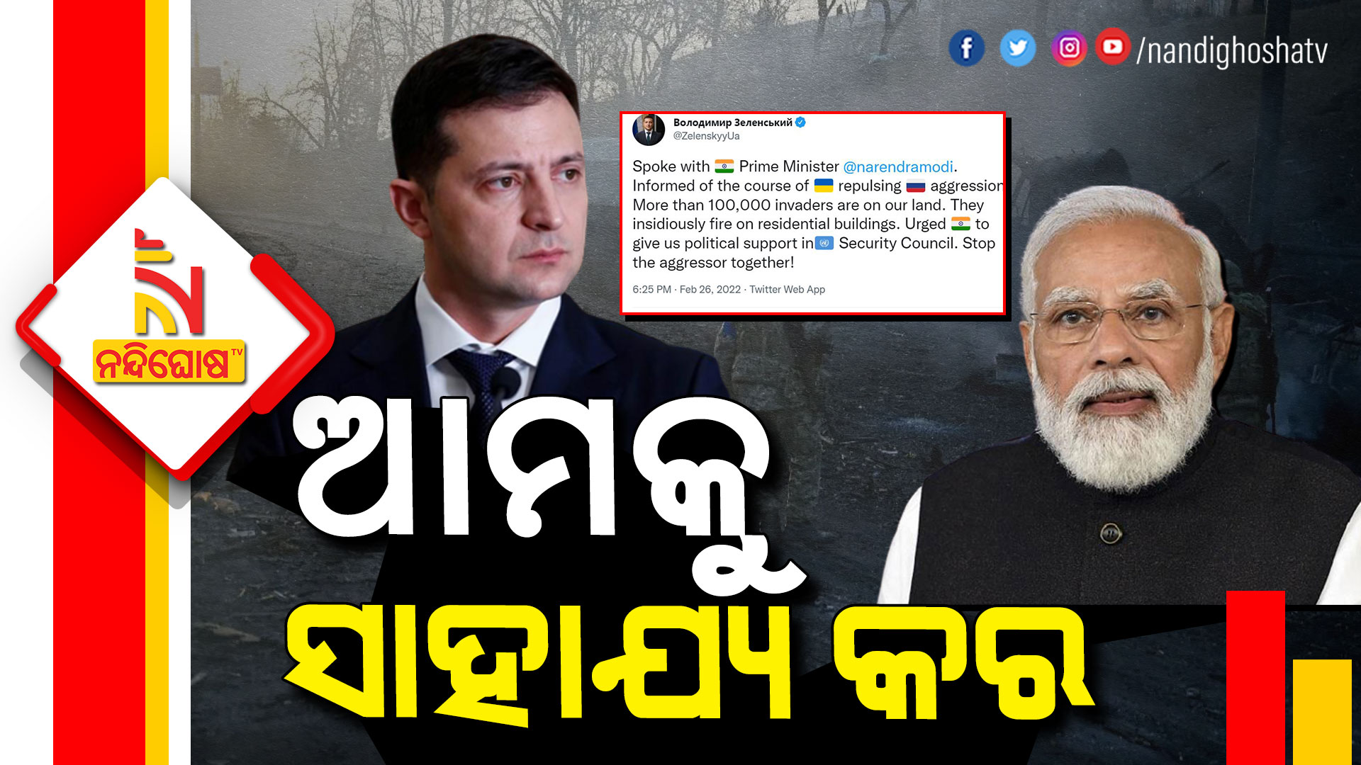 ଶନିବାର ସନ୍ଧ୍ୟାରେ ୟୁକ୍ରେନ ରାଷ୍ଟ୍ରପତି ଭୋଲୋଡିମିର ଜେଲେନସ୍କି ଭାରତ ପ୍ରଧାନମନ୍ତ୍ରୀ ମୋଦୀଙ୍କ ସହ କଥା ହୋଇଛନ୍ତି । ଏନେଇ ସେ ନିଜେ ସୋସିଆଲ ମିଡିଆରେ ଏହି ସୂଚନା ଦେଇଛନ୍ତି। ଜେଲେନସ୍କିଙ୍କ ଅନୁଯାୟୀ- ମୁଁ ପ୍ରଧାନମନ୍ତ୍ରୀ ମୋଦୀଙ୍କ ସହ କଥା ହୋଇ ସାହାଯ୍ୟ ମାଗିଛି। ଦେଶ ଉପରେ ୧ ଲକ୍ଷ ଅନୁପ୍ରବେଶକାରୀ ଆକ୍ରମଣ କରିଛନ୍ତି। ଆମ ଘର ଓ ମାଟି ଉପରେ କବଜା କରିଛନ୍ତି । ଆମ ଘର ଜଳୁଛି, ଏପରି ଘଡିସନ୍ଧି ମୂହୁର୍ତ୍ତରେ ଆମକୁ ରାଜନୖେତିକ ଓ ଅନ୍ୟ ସହାୟତା କରନ୍ତୁ । ମିଳିତ ଜାତିସଂଘ ସୁରକ୍ଷା ପରିଷଦରେ ୟୁକ୍ରେନକୁ ସମର୍ଥନ କରନ୍ତୁ ବୋଲି ଆମେ ଆଶା କରୁଛୁ । ଆମେ ସମସ୍ତେ ଏକାଠି ହୋଇ ଏହାର ସାମ୍ନା କରିବା ଜରୁରୀ ।
