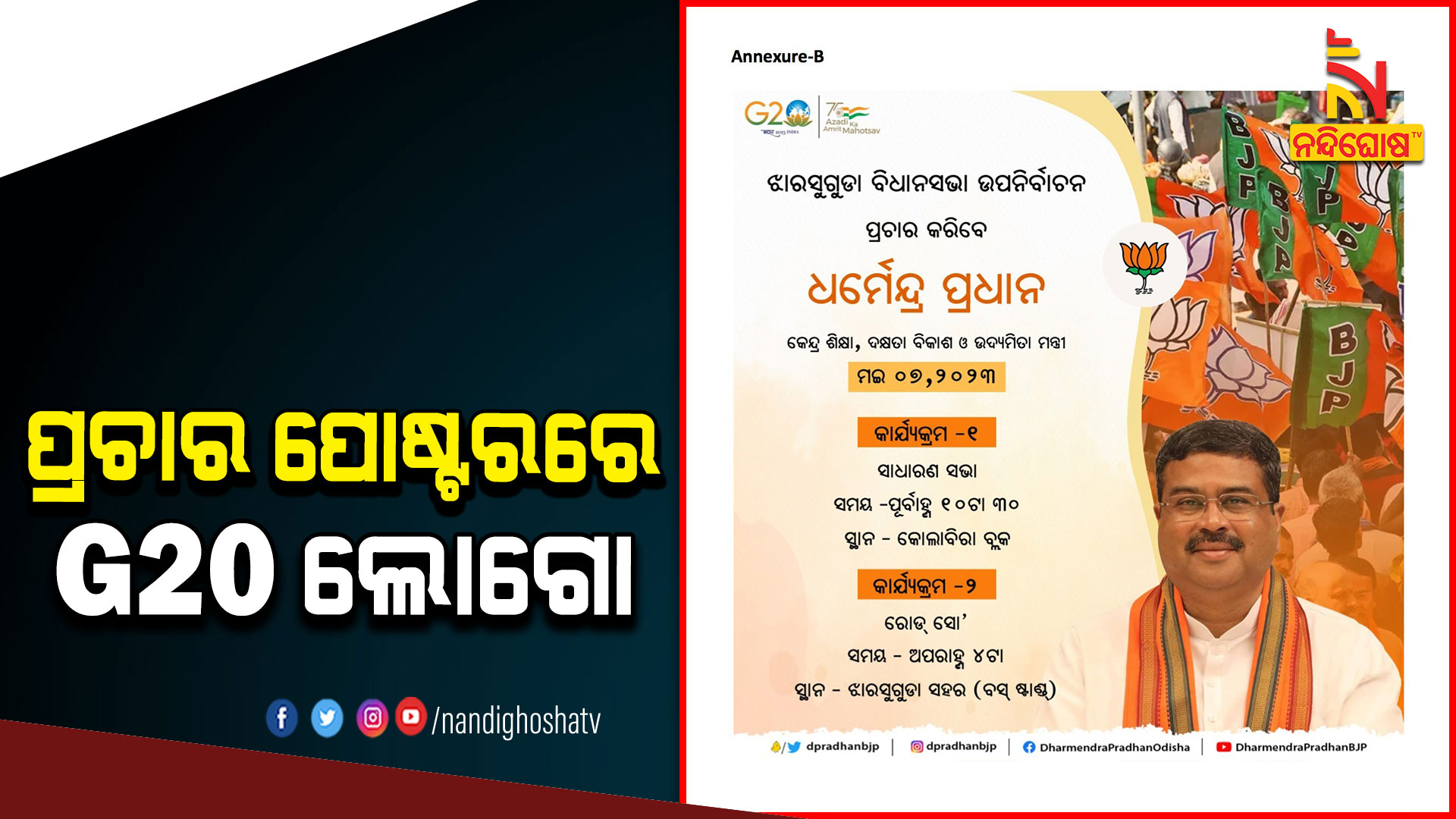 ଭୁବନେଶ୍ବର: ବିଜେପି ବିରୋଧରେ ପୁଣି ଆଦର୍ଶ ଆଚରଣ ବିଧି ଉଲ୍ଲଂଘନ ଅଭିଯୋଗ । ଏନେଇ ରାଜ୍ୟ ମୁଖ୍ୟ ନିର୍ବାଚନ ଅଧିକାରୀଙ୍କୁ ଫେରାଦ ହେଲା ବିଜେଡି । କେନ୍ଦ୍ରମନ୍ତ୍ରୀ ଧର୍ମେନ୍ଦ୍ର ପ୍ରଧାନଙ୍କ ରି- ଟୁଇଟ ପ୍ରସଙ୍ଗ ଉଠାଇ ବିଜେଡି କହିଛି, ଝାରସୁଗୁଡ଼ାରେ ପ୍ରଚାର ପାଇଁ ପ୍ରସ୍ତୁତ ହୋଇଥିବା କେନ୍ଦ୍ରମନ୍ତ୍ରୀଙ୍କ ପୋଷ୍ଟରରେ ଜି-20 ଲୋଗୋ ଏବଂ ଆଜାଦି କା ଅମୃତ ମହୋତ୍ସବର ଲୋଗୋ ରହିଛି । ଯାହା କି ନିର୍ବାଚନ ଆଚରଣ ବିଧି ଉଲ୍ଲଂଘନ ବୋଲି ଅଭିଯୋଗ କରିଛି ବିଜେଡି ।