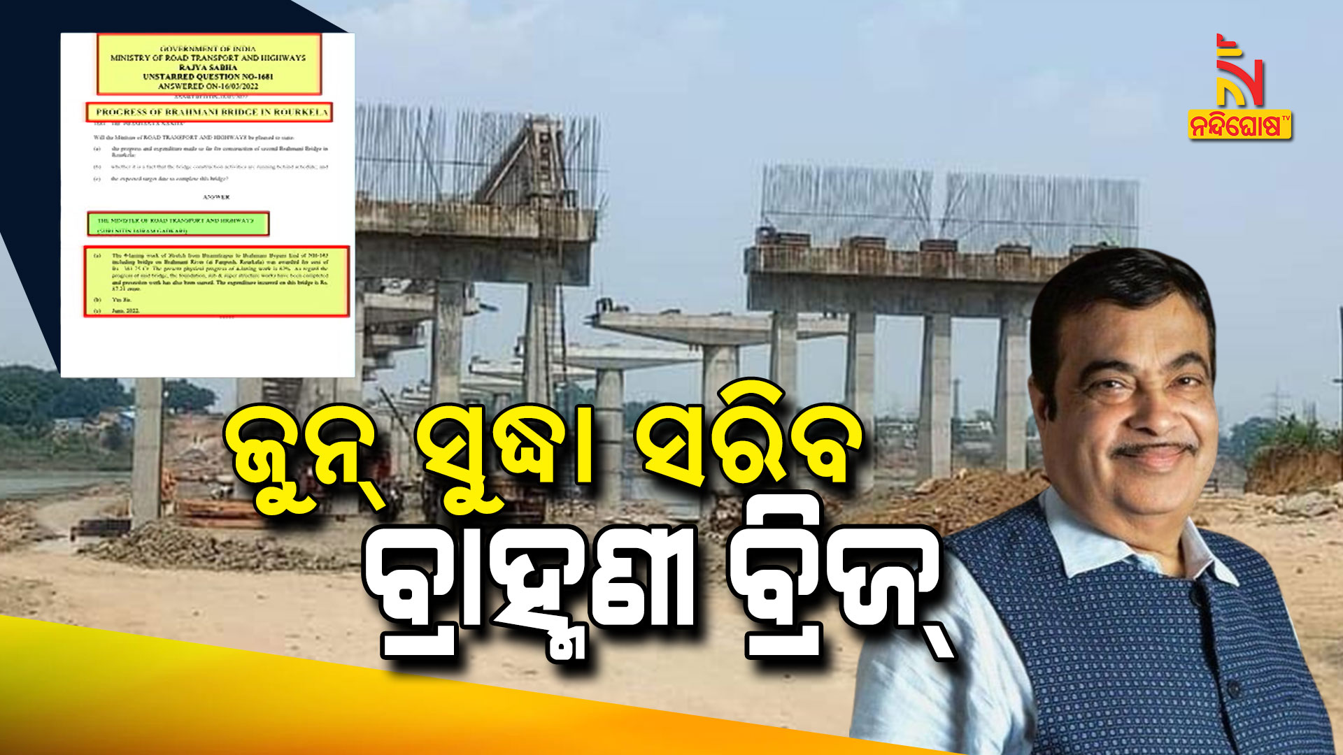 ନୂଆଦିଲ୍ଲୀ: ଚଳିତବର୍ଷ ଜୁନ୍ ସୁଦ୍ଧା ସମ୍ପୂର୍ଣ୍ଣ ହେବ ରାଉରକେଲା ବ୍ରାହ୍ମଣୀ ବ୍ରିଜ୍ । ରାଜ୍ୟସଭାରେ ବିଜେଡି ସାଂସଦ ପ୍ରଶାନ୍ତ ନନ୍ଦଙ୍କ ପ୍ରଶ୍ନରେ ଏପରି ପ୍ରତିଶ୍ରୁତି ଦେଇଛନ୍ତି କେନ୍ଦ୍ର ସଡ଼କ ପରିବହନ ଓ ଜାତୀୟ ରାଜପଥ ମନ୍ତ୍ରୀ ନିତିନ୍ ଗଡ଼କରୀ । କେନ୍ଦ୍ର ମନ୍ତ୍ରୀ ସ୍ୱୀକାର କରିଛନ୍ତି ବ୍ରିଜ୍ କାମରେ ବିଳମ୍ବ ହୋଇଛି । ବୀରମିତ୍ରପୁରରୁ ବ୍ରାହ୍ମଣୀ ବାଇପାସ୍ ୧୪୩ ନମ୍ବର ଜାତୀୟ ରାଜପଥକୁ ୪ ଥାକିଆ କରିବା ପାଇଁ ୩୮୧ କୋଟି ୭୫ ଲକ୍ଷ ଟଙ୍କା ଖର୍ଚ୍ଚ ହେବା ନେଇ ବ୍ୟୟ ଅଟକଳ ହୋଇଛି । ଏହି ରାଜପଥର ୮୨ ପ୍ରତିଶତ କାମ ସମ୍ପୂର୍ଣ୍ଣ ହୋଇଛି । ସେଥିରୁ ୮୭ କୋଟି ୨୧ ଲକ୍ଷ ଟଙ୍କା ଖର୍ଚ୍ଚରେ ପାନପୋଷଠାରେ ବ୍ରାହ୍ମଣୀ ନଦୀ ଉପରେ ସେତୁ ନିର୍ମାଣ କାମ ଆଗେଇ ଚାଲିଥିବା କେନ୍ଦ୍ର ମନ୍ତ୍ରୀ ଲିଖିତ ଉତ୍ତର ରଖିଛନ୍ତି ।