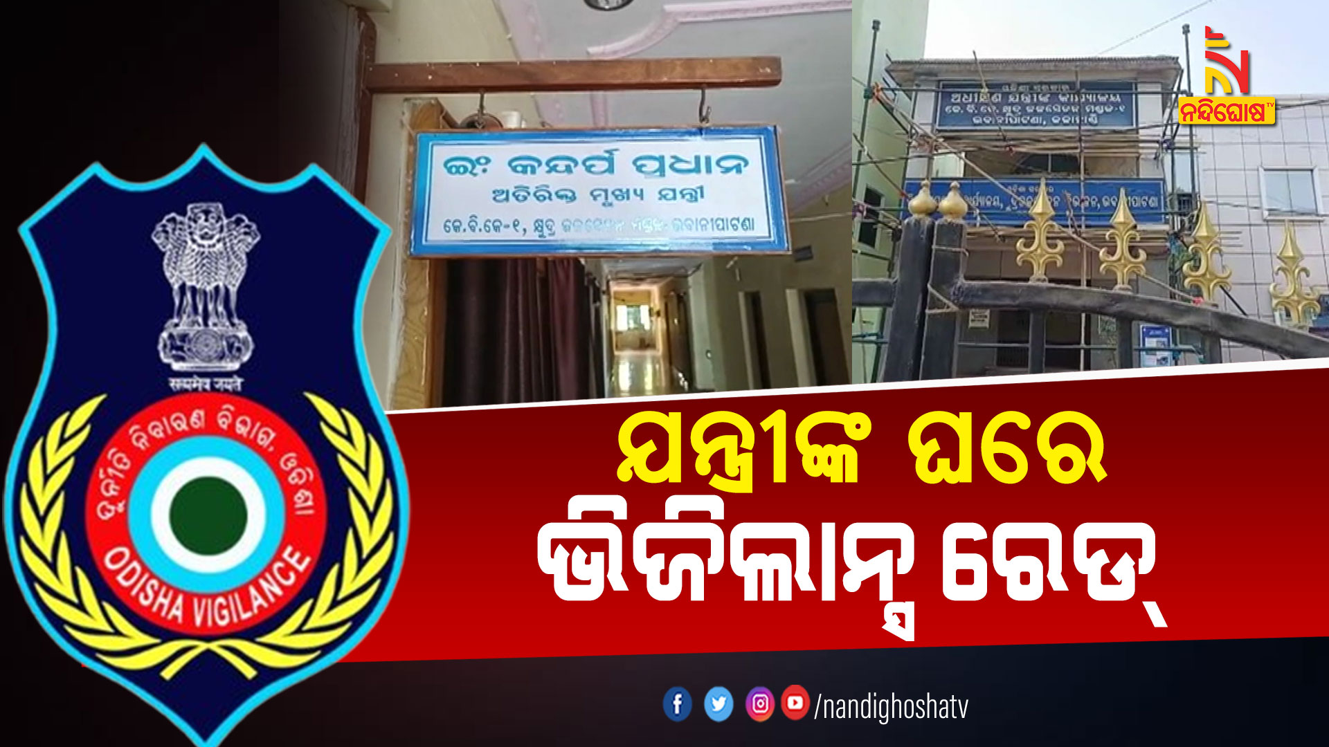 ଭବାନୀପାଟଣା: ଭିଜିଲାନ୍ସ ଜାଲରେ ଭବାନୀପାଟଣା କେବିକେ MI ସର୍କଲ ଅତିରିକ୍ତ ମୁଖ୍ୟ ଯନ୍ତ୍ରୀ କନ୍ଦର୍ପ ପ୍ରଧାନ । ଆୟ ବହିର୍ଭୂତ ସମ୍ପତ୍ତି ଠୁଳ ଅଭିଯୋଗରେ ଏକକାଳୀନ ୮ଟି ସ୍ଥାନରେ ରେଡ୍ ହୋଇଛି। ଭୁବନେଶ୍ବରର ୩ଟି, ଅନୁଗୁଳର ୨ଟି, ଭବାନୀପାଟଣାର ଅଫିସ ଚାମ୍ବର ଓ ସରକାରୀ କ୍ବାର୍ଟରେ ରେଡ୍ ହୋଇଥିବା ସୂଚନା ମିଳିଛି । ରସୁଲଗଡ ବୈଷ୍ଣୋ ମୋନାର୍କ ଆପାର୍ଟମେଣ୍ଟର ୩୦୧ ନମ୍ବର ଫ୍ଲାଟ୍, ଖାରବେଳନଗର ବୈଷ୍ଣୋ ରେଗେନ୍ସିରେ ଥିବା ପ୍ରଥମ ମହଲା ଘର, ସହିଦନଗର ଇମ୍ପେରିଆ ଆପାର୍ଟମେଣ୍ଟରେ ଥିବା ପ୍ରଥମ ମହଲାରେ ଚାଲିଛି ଭିଜିଲାନ୍ସ ଛାପା ।