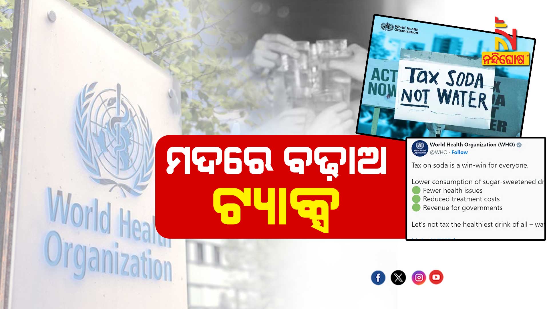 ସଂଗଠନ କହିଛି ମଦ୍ୟପାନ ଯୋଗୁ ପ୍ରତିବର୍ଷ ବିଶ୍ବରେ ୨୬ ଲକ୍ଷ ଲୋକ ପ୍ରାଣ ହରାଇଥାନ୍ତି । ସେହିପରି ଅସ୍ବାସ୍ଥ୍ୟକର ଖାଦ୍ୟ ଖାଇ ବାର୍ଷିକ ୮୦ ଲକ୍ଷ ଲୋକଙ୍କ ଜୀବନ ଯାଇଥାଏ । ଯଦି ମଦ ଓ ଚିନିମିଶ୍ରିତ ମଦ୍ୟ ମଦ୍ୟଜାତୀୟ ସାମଗ୍ରୀ ଉପରେ ଅଧିକ କର ଲାଗୁ କରାଯାଏ ତେବେ ଅନେକ ଲୋକଙ୍କ ଜୀବନ ରକ୍ଷା ପାଇପାରିବ । ସଂଗଠନ ପକ୍ଷରୁ କୁହାଯାଇଛି- ଏହି ଧରଣର ସାମଗ୍ରୀ ଉପରେ ୧୦୮ଟି ରାଷ୍ଟ୍ର ସାମାନ୍ୟ ଅଧିକ କର ଲାଗୁ କରିଛନ୍ତି । ସେହି ରାଷ୍ଟ୍ରଙ୍କ ମଧ୍ୟରୁ ଅର୍ଦ୍ଧାଧିକ ରାଷ୍ଟ୍ରରେ ପାଣି ଉପରେ କର ଲାଗୁ କରୁଛନ୍ତି ଯାହାକି ବିଶ୍ବ ସ୍ବାସ୍ଥ୍ୟ ସଂଗଠନ ଅନୁମତି ଦେଇନାହିଁ ।