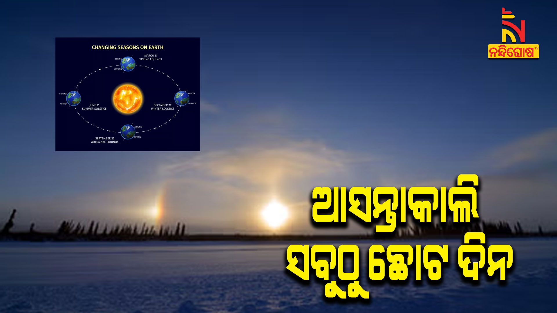 ନନ୍ଦିଘୋଷ ବ୍ୟୁରୋ: ଆସନ୍ତାକାଲି ସବୁଠୁ ଛୋଟ ଦିନ। ପ୍ରତିବର୍ଷ ଡିସେମ୍ବର ୨୧ କିମ୍ବା ୨୨ତାରିଖରେ ଉତ୍ତର ଗୋଲାର୍ଦ୍ଧରେ ଶୀତଋତୁର ପ୍ରଥମ ଦିନ ଆରମ୍ଭ ହୋଇଥାଏ। ଏହାବର୍ଷର “ସବୁଠାରୁ ଛୋଟ ଦିନ” ହୋଇଥାଏ । ଜ୍ୟୋତିର୍ବିଜ୍ଞାନୀଙ୍କ ମତରେ ବର୍ଷର ଏହି ସବୁଠାରୁ ଛୋଟ ଦିନରୁ ଉତ୍ତର ମେରୁରେ ଶୀତଦିନ ଆରମ୍ଭ ହୁଏ । ଫଳରେ ଦକ୍ଷିଣ ମେରୁରେ ଧୀରେ ଧୀରେ ଦିନଗୁଡ଼ିକ ଅଧିକରୁ ଅଧିକ ଲମ୍ବା ହୁଏ । ମାର୍ଚ୍ଚ ମାସ ବେଳକୁ ଦିନ ଓ ରାତିର ଅବଧି ପାଖାପାଖି ସମାନ ରହେ।